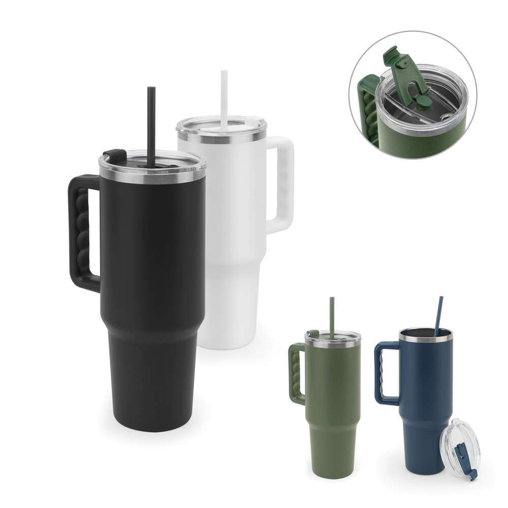 Copo de viagem de grande dimensão para se manter hidratado durante o dia sem a necessidade de recargas constantes. Composto por aço inox 91% reciclado, com parede dupla isolada a vácuo e acabamento em mate. Este copo pode ser utilizado de duas maneiras: através da sua abertura para canudo ou do orifício para utilização direta (pode ser fechado). A sua pega facilita o transporte quer seja para o trabalho ou para atividades ao ar livre. Capacidade até 1300 mL. Fornecido em caixa presente de papel kraft reciclado. Certificação EU Food Grade. ø143 x 257 mm (sem canudo) | Canudo: 305 mm.